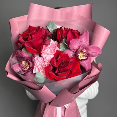 Букет из 3 красных роз, орхидей и диантуса